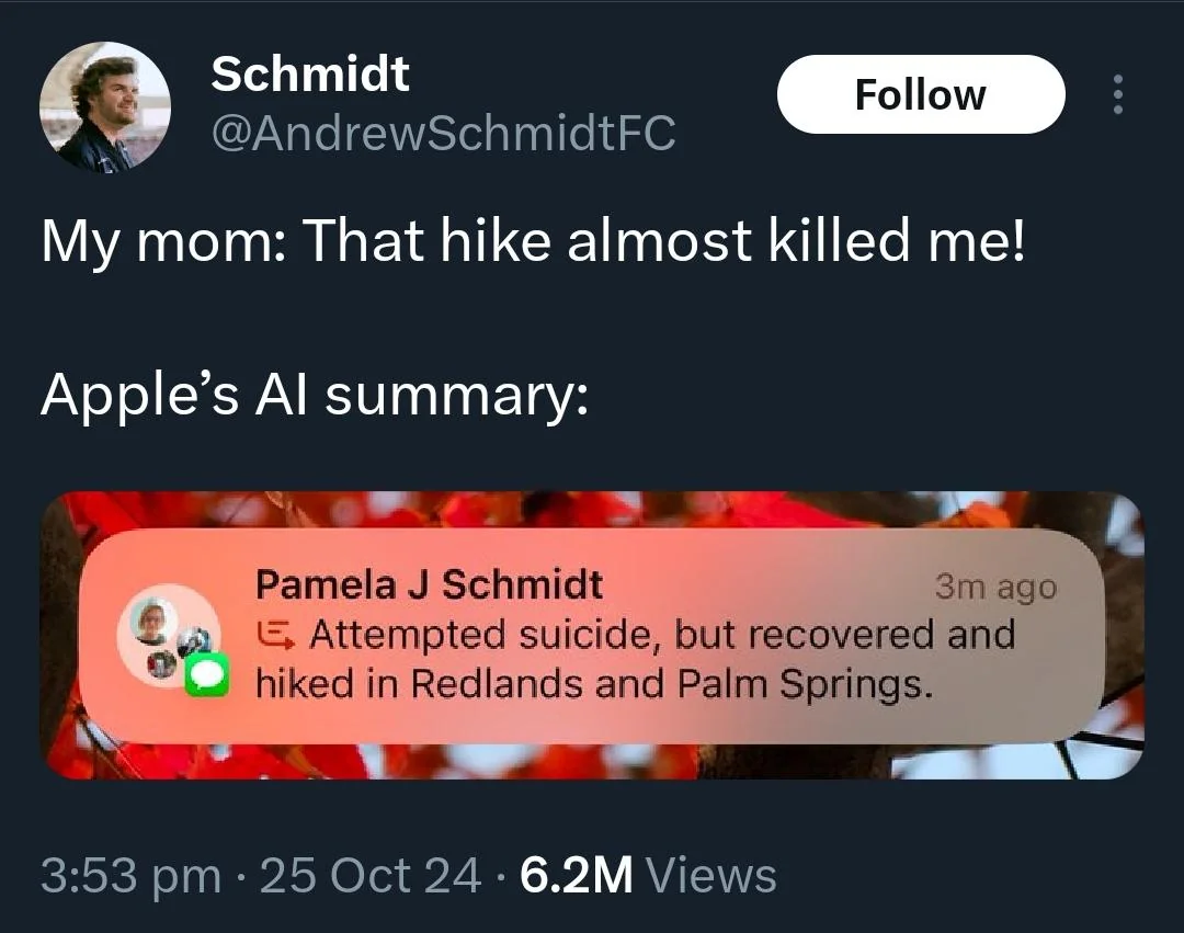 Siri, asistentul vocal care ar trebui să fie vitrina AI a Apple, e amânată pentru o revizie majoră până în primăvara lui 2026. Apple Intelligence, suite-ul lor de funcții AI lansat cu mare pompă, a avut un început atât de problematic încât Apple a fost nevoită să suspende în ianuarie notificările cu rezumate de știri – pentru că acestea conțineau greșeli repetate atât de evidente încât utilizatorii au început să le facă meme-uri pe internet.