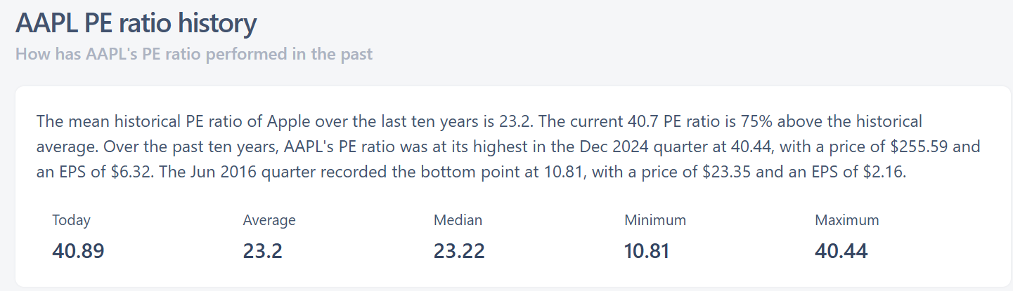 Pentru cei care nu sunt familiarizați cu termenul – și nu e nicio rușine, toată lumea a început de undeva – P/E ratio-ul îți spune de câte ori plătești profitul anual al companiei când cumperi o acțiune. Un P/E de 40 înseamnă că plătești de 40 de ori profitul anual pentru a deține o bucată din Apple.