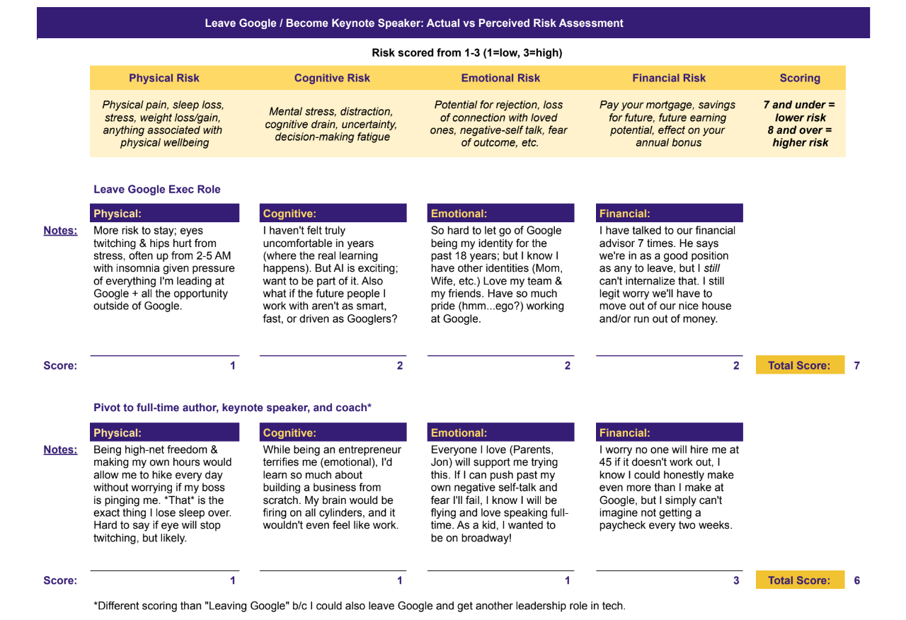Jenny a creat o matrice de risc cu patru categorii: fizic, cognitiv, emoțional și financiar. Fiecare evaluat pe o scală de la 1 la 3. Simplă, dar brutală în onestitatea ei.