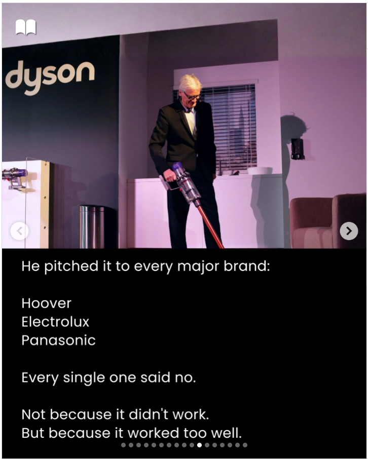 Imaginați-vă scenariul: sunteți CEO la Hoover în 1982. Intră în birou un tip cu părul zbârlit, îndatorat până în gât, care vă arată un aspirator fără sac. Funcționează. E mai eficient. Testele sunt convingătoare.