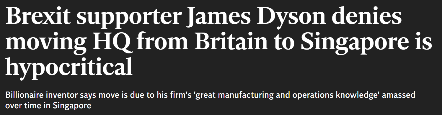 În 2016, Sir James Dyson – miliardarul britanic care a reinventat aspiratorul – a donat generos campaniei pentru Brexit, susținând că Marea Britanie trebuie să-și „recapete controlul” și să sprijine industria locală. Trei ani mai târziu, același Dyson și-a mutat sediul companiei în Singapore și a relocat producția în Malaezia. Ironic, nu?