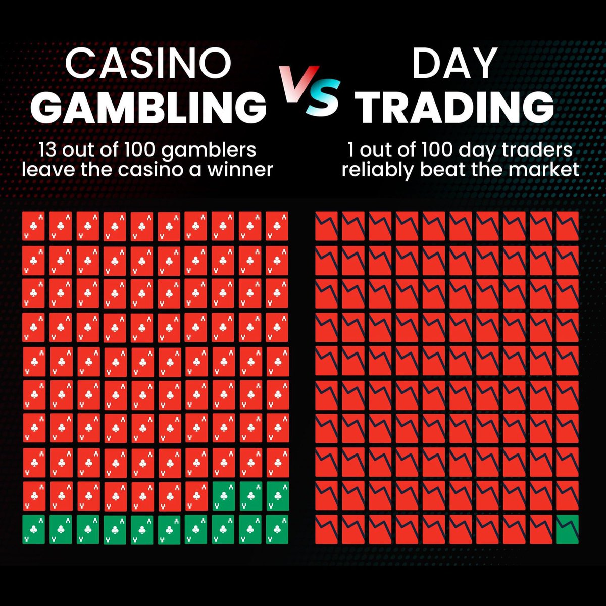 Să pun asta în perspectivă: ai șanse mai mari să câștigi la blackjack dacă înveți să numeri cărți (și nu te prinde securitatea cazinoului) decât să faci profit sustenabil din day trading.