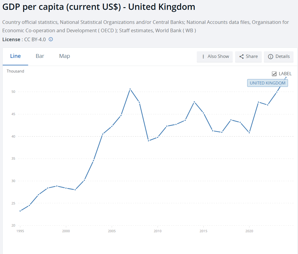 Cifrele sunt dure: PIB-ul pe cap de locuitor al Marii Britanii este mai mic astăzi decât era în 2006 (ținând cont de inflație). Într-o perioadă în care restul lumii dezvoltate a crescut, UK-ul a stagnat sau a regresat.