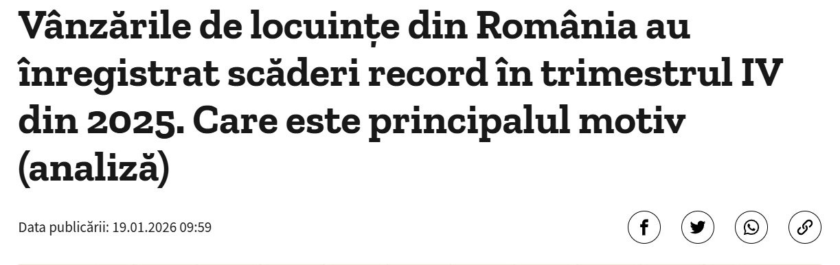 Știi cum e când intri pe Facebook dimineața și vezi doar titluri optimiste despre „România, economia în creștere” și „perspective strălucite pentru 2026”? Ei bine, haideți să vorbim despre un record de care nimeni nu se laudă, dar care afectează direct buzunarele a milioane de români: trimestrul IV din 2025 a adus cele mai slabe vânzări de locuințe din ultimii șase ani la nivel național, iar pentru București-Ilfov, vorbim de cel mai prost rezultat din ultimii nouă ani.