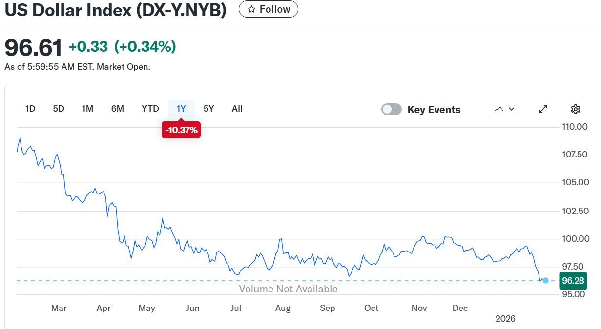 La 28 ianuarie 2026, indicele dolarului american (DXY) a căzut la aproximativ 96,15, cel mai scăzut nivel din februarie 2022. A scăzut cu 8-11% față de maximele din 2025. Doar în ultima lună, minus 2%. Patru sesiuni consecutive de scădere. Dolarul a depășit pragul de 1,20 față de euro.