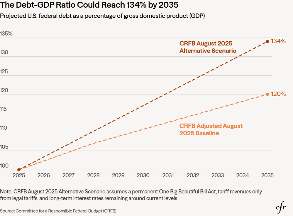 Proiecțiile Biroului Bugetar al Congresului estimează că va ajunge la 120% din PIB până în 2035. Dar asta e scenariul optimist, cel în care totul merge „normal”. Comitetul pentru un Buget Federal Responsabil (CRFB), care include în calcule legislația recentă și randamentele ridicate ale Trezoreriei, estimează 134% din PIB până în 2035.