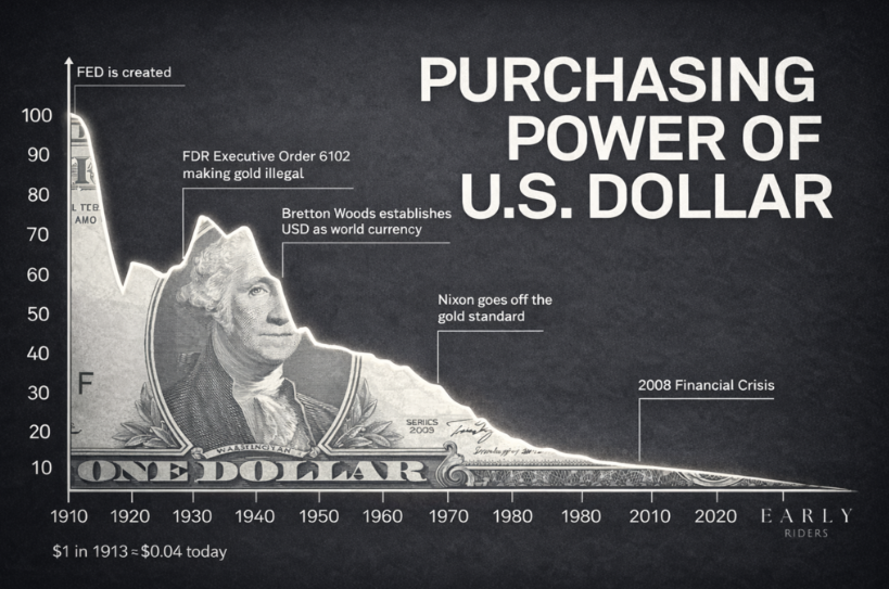 De la înființarea Rezervei Federale în 1913, dolarul american a pierdut aproximativ 96-97% din puterea sa de cumpărare. Un dolar din 1913 echivalează cu trei-patru cenți astăzi.