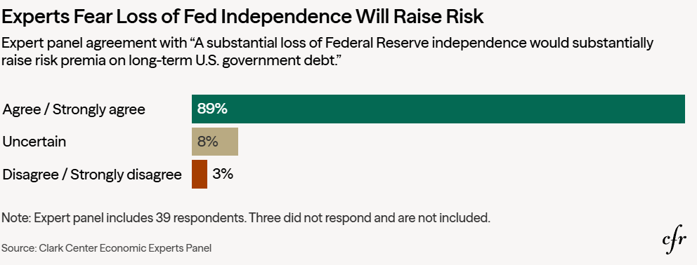 Și înainte să spui că exagerez, ia în considerare asta: 89% dintre economiști sunt de acord că, dacă Rezerva Federală își pierde independența (adică dacă devine instrument direct al politicii guvernamentale), primele de risc cresc, randamentele Trezoreriei explodează, costurile împrumuturilor devin nesustenabile, iar creșterea economică încetinește.