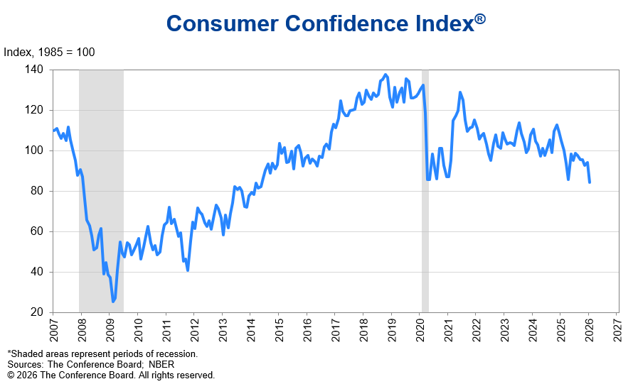 Indicele de încredere a consumatorilor al Conference Board a scăzut la 84,5 în ianuarie 2026, cel mai scăzut nivel din mai 2014. Mai jos decât în timpul pandemiei COVID-19. Citește asta din nou: oamenii sunt mai îngrijorați acum decât când economia globală se închidea complet.