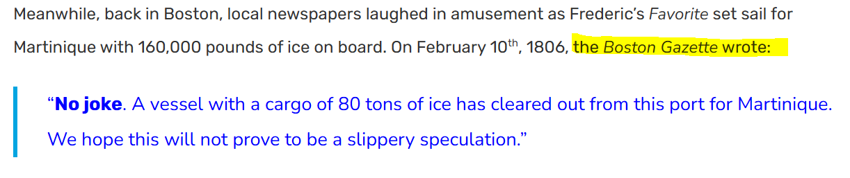 Ideea lui era, tehnic vorbind, simplă: taie gheață din lacurile din Massachusetts iarna, încarcă-o pe nave și vinde-o în Caraibe, unde nu există și unde căldura o face valoroasă. Problema era că nimeni nu credea că gheața poate supraviețui trei săptămâni pe mare, sub soarele tropical. Boston Gazette a comentat cu o ironie pe care n-o poți să n-o apreciezi: „Nu e o glumă, o navă a trecut de vamă cu o încărcătură de gheață. Sperăm că aceasta nu se va dovedi o speculație alunecoasă.”