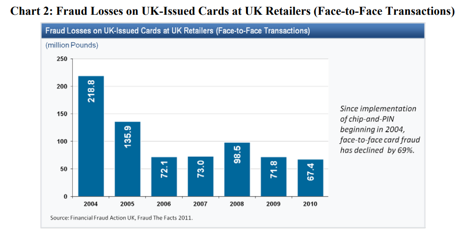 Rezultatele implementării au fost spectaculoase acolo unde a existat voință politică și industrială să se miște rapid. În Marea Britanie, unde Chip and PIN a fost introdus în 2003, frauda prin falsificare a scăzut cu 69% în șapte ani, antrenând o scădere generală de 27% a fraudei cu carduri. În Statele Unite, unde industria financiară a privit această tranziție cu o combinație unică de scepticism și procrastinare instituționalizată, frauda a crescut cu 70% în aceeași perioadă. Abia după breșa de la Target din 2013, când infractorii au furat 40 de milioane de numere de carduri și au produs cloane cu bandă magnetică în serie, americanii au decis că poate, totuși, cipul merită o șansă. Odată implementat, frauda prin falsificare a scăzut cu 76%. Lecția de reținut: uneori lumea nu se mișcă până nu o doare suficient de tare.