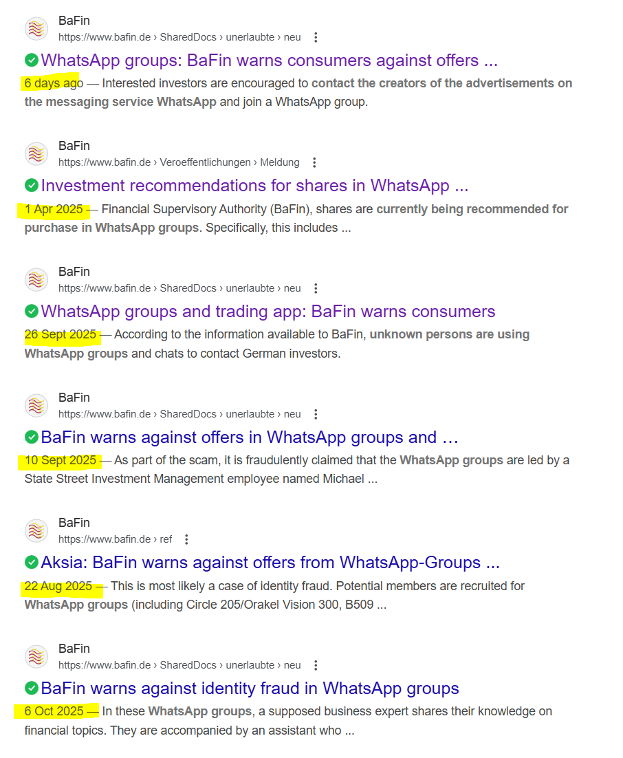 BaFin (autoritatea de reglementare germană) a emis recent avertismente specifice despre firmele care oferă servicii de investiții fără licență prin intermediul grupurilor WhatsApp.