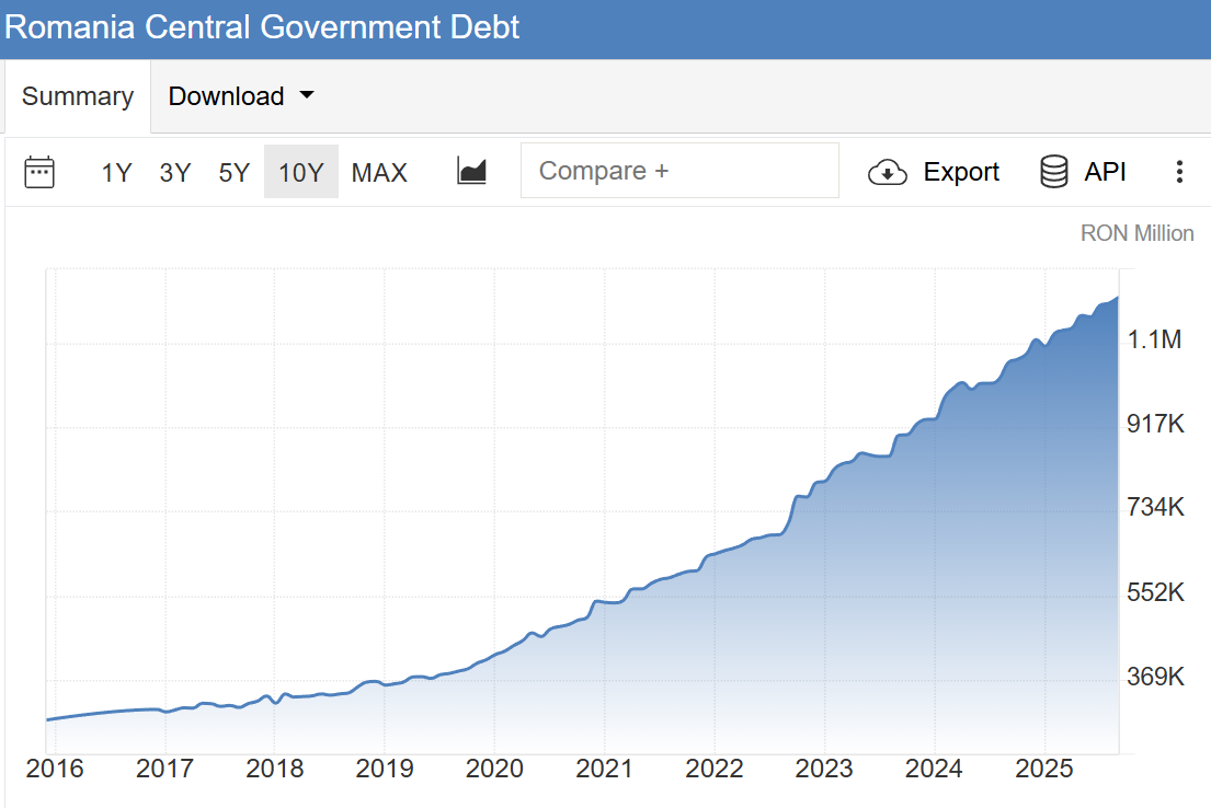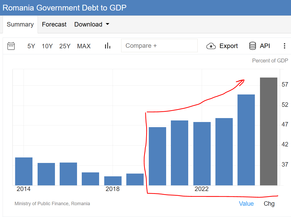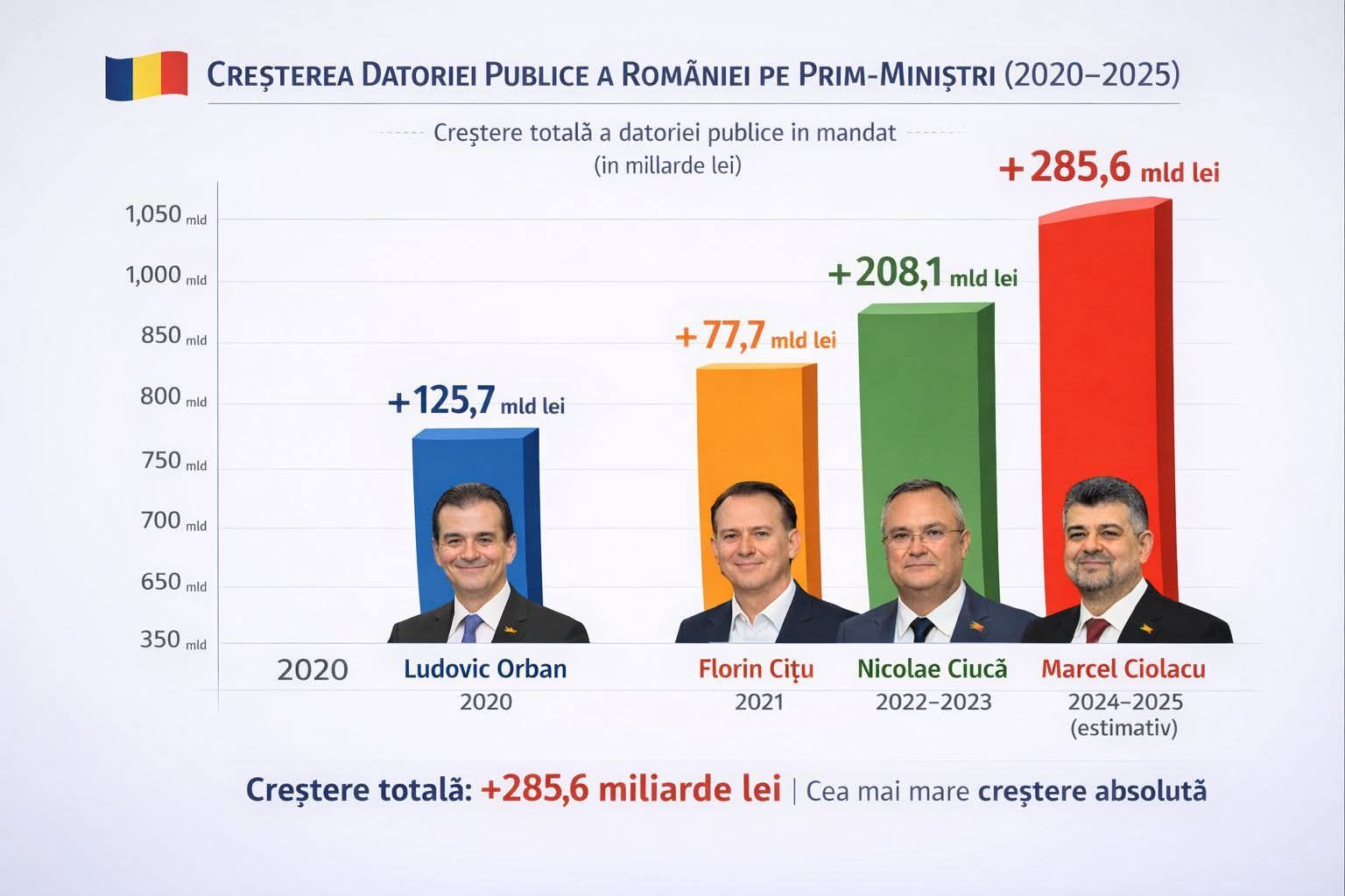 În ultimii cinci ani, doar cinci ani, datoria publică a României a crescut cu aproximativ 800 de miliarde de lei. Pentru context: în cei 30 de ani anteriori, între 1989 și 2019, datoria publică crescuse de la practic zero la 450 de miliarde.