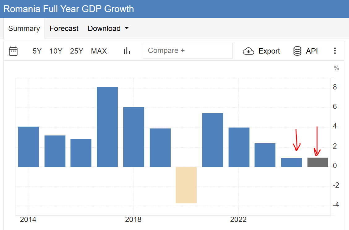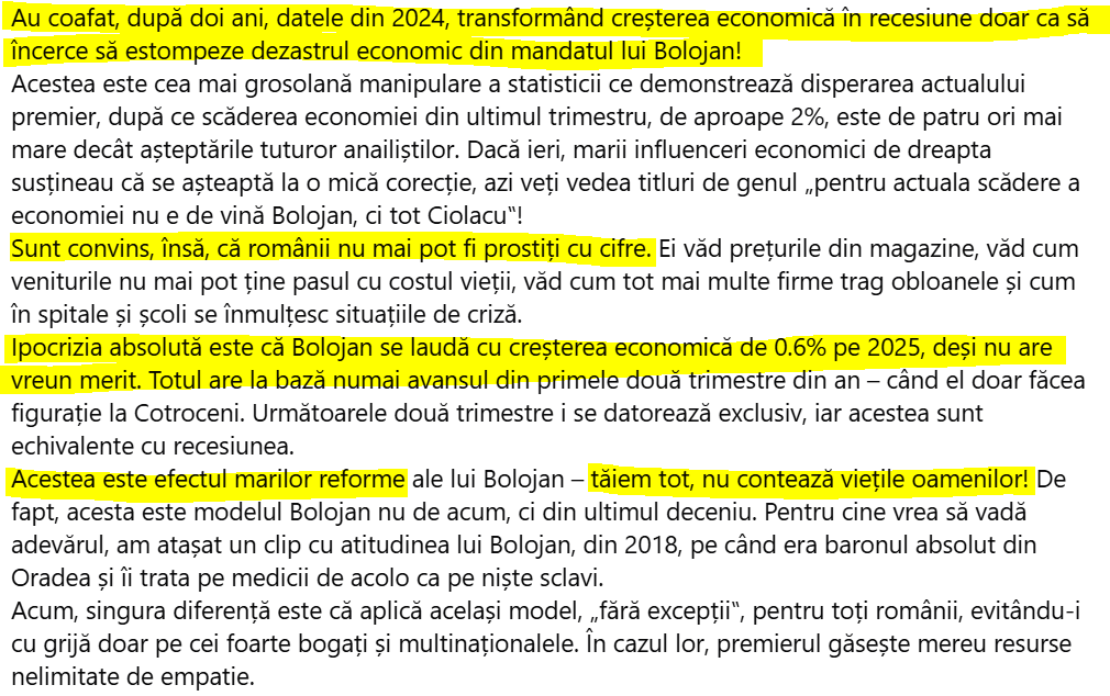 Pentru context: în 2024, cu toate cadourile electorale, salarii în sectorul public majorate cu 24%, pensii cu 20%, consum susținut artificial cu bani împrumutați, economia a crescut cu 0,9%. Deci diferența între anul „generos” și anul „de criză” este de 0,3 puncte procentuale.