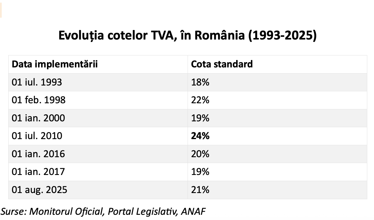 Dacă primii ani au erodat încrederea mediului de afaceri, august 2025 a lovit direct în portofelul omului de rând. TVA-ul standard a urcat de la 19% la 21%. Cotele reduse, cele care se aplicau pe produse de bază, cele pe care gospodăriile cu venituri mici le simțeau cel mai direct, au fost și ele majoriate sau unificate. Cota de 5% a dispărut.