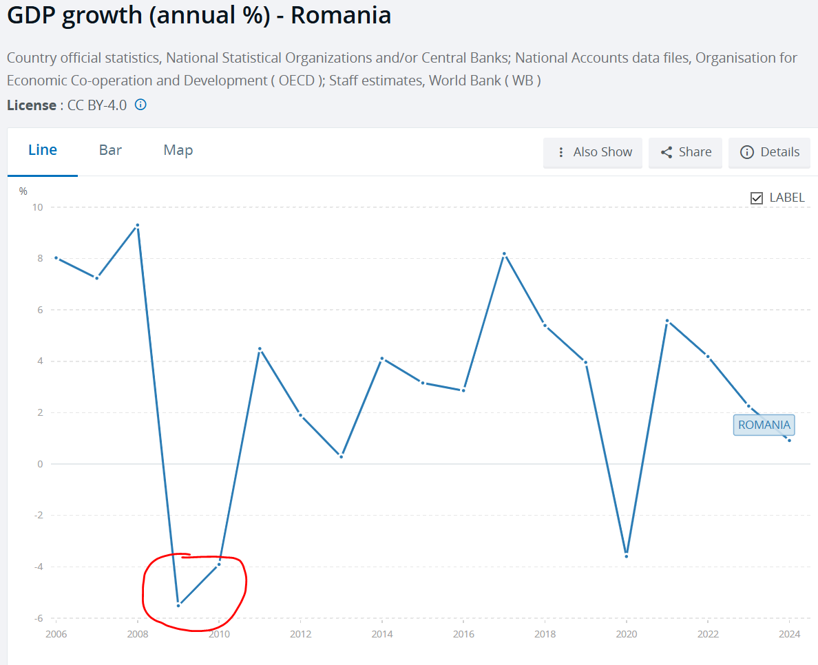 În 2008-2010, România a avut o depresiune economică, nu o recesiune tehnică. PIB-ul a scăzut cu peste 6% în 2009. ROBOR-ul a explodat peste 20%. Leul s-a prăbușit de la 3,3 lei/euro la peste 4 lei/euro în câteva luni. Șomajul a sărit spre 10%. Consumul s-a prăbușit cu peste 10%. Insolventele firmelor au depășit 25.000 pe an. Băncile nu mai dădeau credite. Oamenii își pierdeau casele.