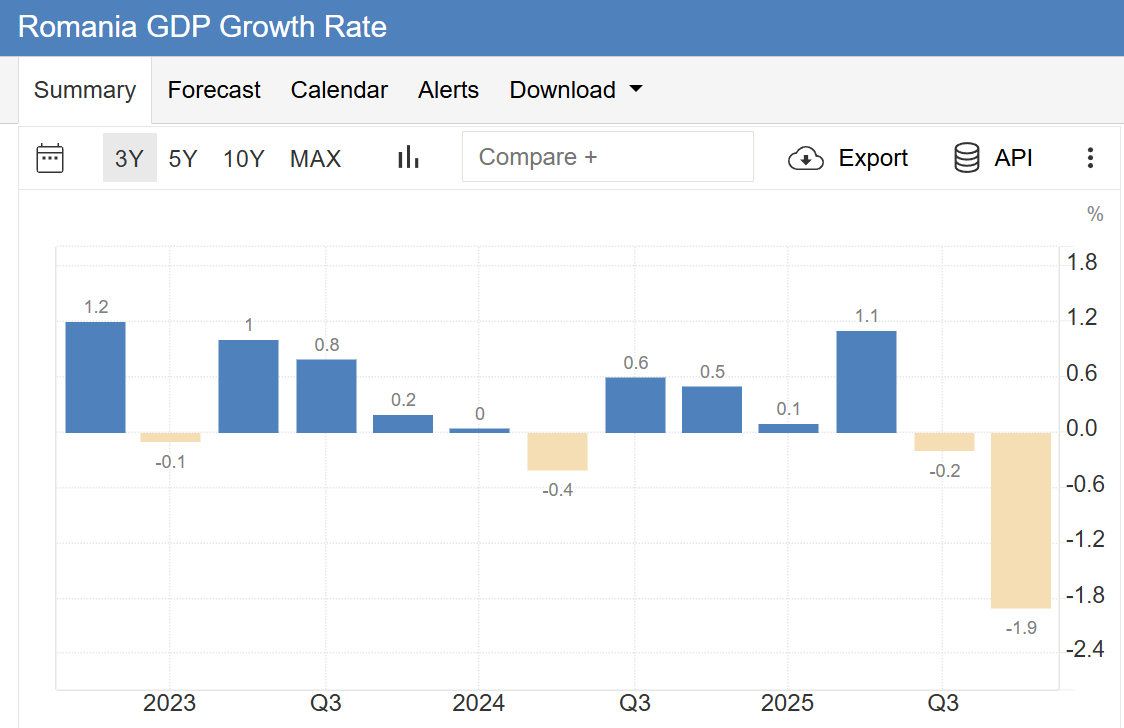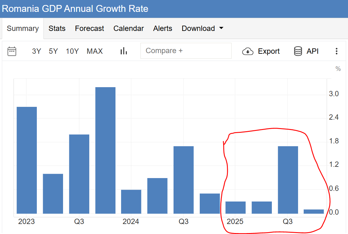 România a înregistrat, conform datelor INS, o scădere de 0,2% în trimestrul III din 2025 față de trimestrul anterior, și o scădere de 1,9% în trimestrul IV față de trimestrul III. Pe întreg anul 2025, economia a crescut totuși cu 0,6%. Deci nu vorbim despre o prăbușire. Vorbim despre o frânare.