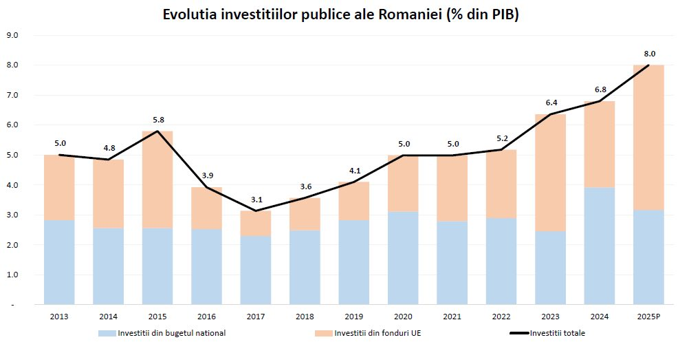 Și acum, cea mai importantă cifră pe care nimeni nu a strigat-o în headline-uri: în 2025, România a înregistrat cele mai mari investiții publice ca procent din PIB din istoria sa recentă, peste 8,2% din PIB.